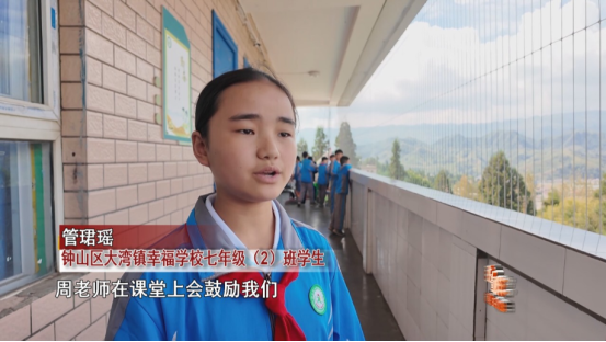 六盘水市钟山区大湾镇幸福学校七年级(2)班学生 管珺瑶 周老师在课堂上会鼓励我们,让我们找到了自信,然后就自然带动了我们的学习积极性,慢慢就让我们融入了学习状态中。
