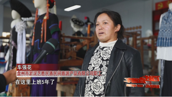 盘州市淤泥艺胜民族民间旅游产品有限公司职工车强花我在这里上班5年了,每个月工资有3000块钱,离家也很近。我行动也不方便,又能在这里上班,又能够照顾家庭,我很高兴。