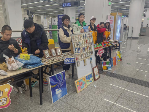 活动于上午十点半正式开始,以“公益义卖”与“互动体验”为主要内容,现场展售由心智障碍学员精心制作的文创手工艺品、烘焙食品等,与常规义卖活动不同,本次活动的“售货员”、“咖啡师”均为来自慧灵的特殊学员。在志愿者协助下,学员们有条不紊地开展工作:地铁入口的展台上,整齐摆放着学员参与制作的糕点、饮品;地铁站内的售卖点上,各类精心制作的手工艺品琳琅满目,充分展现了学员们的动手能力与创造力,过往市民纷纷被活动吸引,主动停下脚步,不仅踊跃选购爱心商品、体验手冲咖啡,更以微笑、点赞等方式与学员们亲切互动,在轻松愉快的交流中拉近了距离,实现了良好互动,营造了理解、包容、平等、友爱的活动氛围。